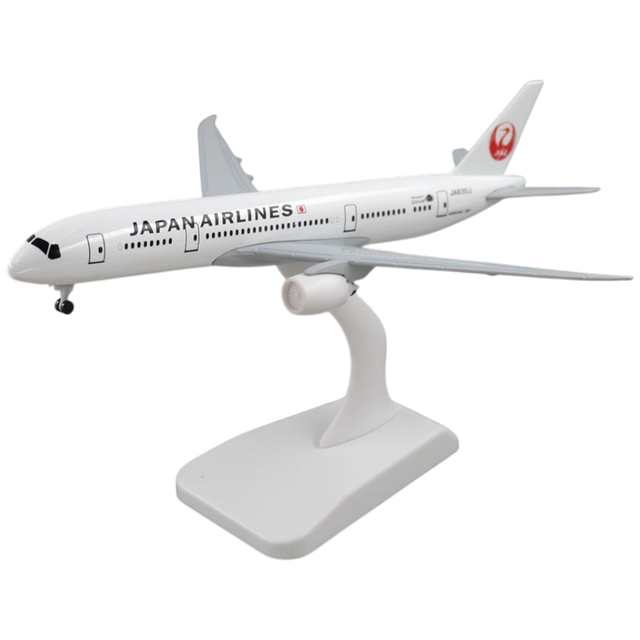 The Japan Airlines Boeing 787 Dreamliner is a marvel of modern aviation, recognized for its advanced design, fuel efficiency, and comfort-focused cabin features. Japan Airlines, one of the world's leading airlines, operates this aircraft on major international routes, offering a premier travel experience. This model captures the aircraft’s iconic white fuselage and red crane logo, symbolizing elegance and reliability in Japanese air travel.