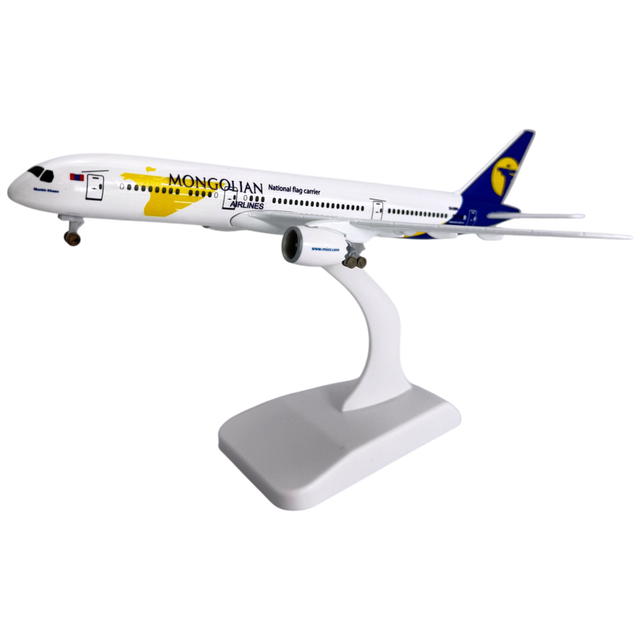 Capture the spirit of modern aviation with this 1/300 scale airplane model. Featuring the distinct Mongolian Airlines livery, this model plane serves as a high-quality tribute to the Dreamliner's engineering. This scale model is crafted for precision, ensuring that every curve of the fuselage is represented accurately in a compact size.